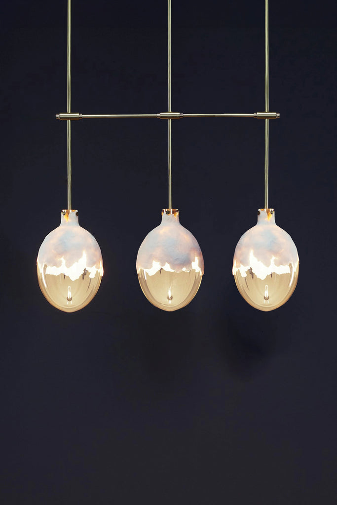 The raw paper appears to ‘grow’ over three hand-blown glass eggs, suspended by hand-crafted brass to create a chandelier that contrasts sharp geometricity with organic form. Part of the GLOW collection in collaboration with Sophie Dries, GLOW 3 IN LINE is a lighting object in which technical precision and material delicacy sit side-by-side.