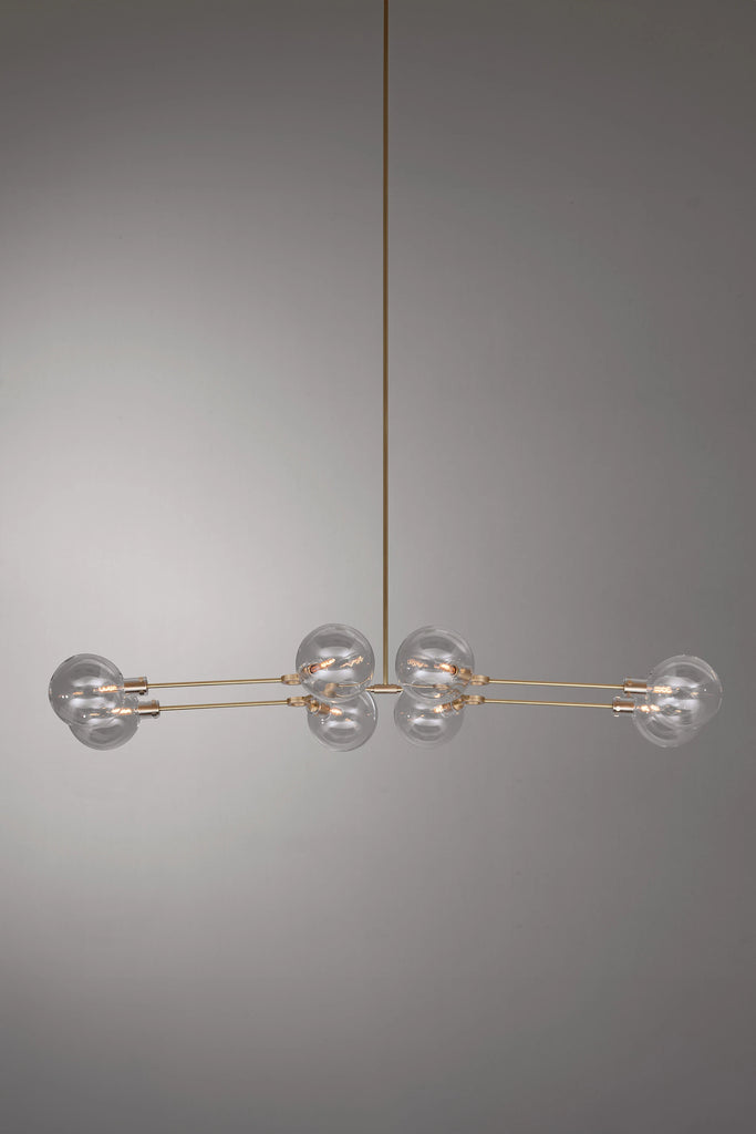 Perfection comes to the fore in our modern glass chandeliers like the ORA SYMMETRICAL. An even network of hand-crafted brass rings and stems hold in place eight hand-blown glass spheres. Its brass network fuses form and function and is moveable to allow the piece to be designed into endless compositions – from simple to complex. The result is a rigorous and intriguing centrepiece chandelier that captures KAIA’s essence at the boundary of technicality and artistry, a delicate constellation of stars lighting up the room