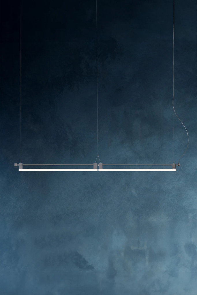 This design from EON collection features two centrally connected lights to create a linear lighting object. This is suspended from the ceiling by three transparent cables. Clean, linear and clever lighting for the contemporary home.