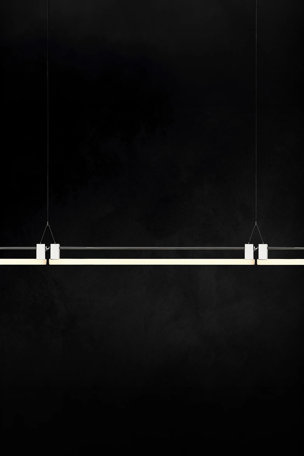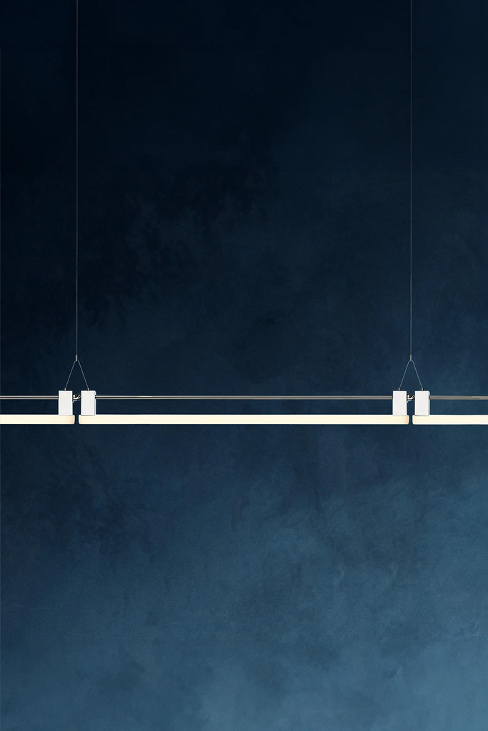 This linear pendant light from the EON collection features three centrally connected lights to create a linear lighting object. This is suspended from the ceiling by four transparent cables. Clean, linear and clever lighting for the contemporary home.