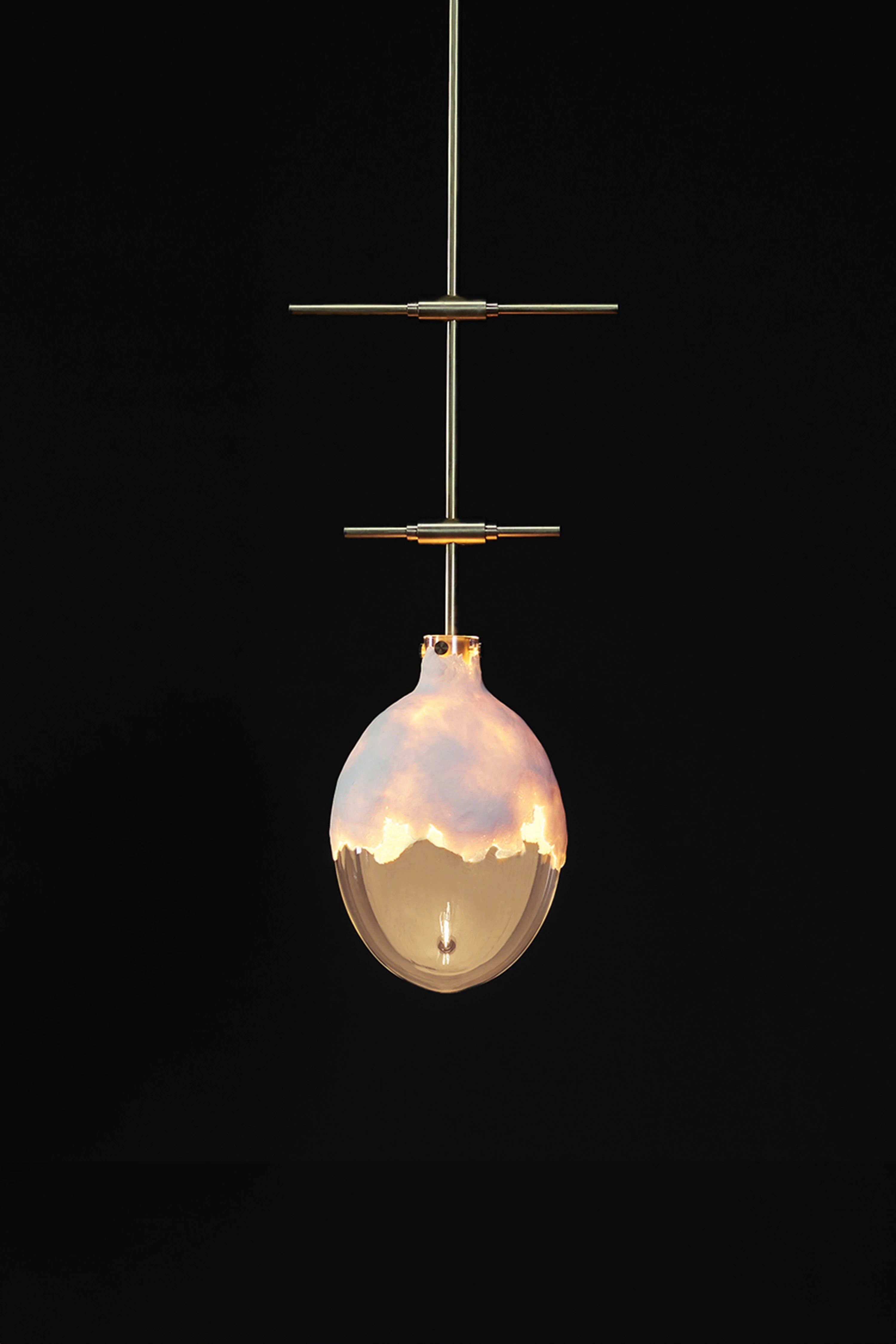 GLOW 1 PENDANT are designer light pendants that merge custom-made glass, hand-crafted brass, and organic paper that evolves the papier-mâché process. Designed by architect and designer Sophie Dries, the result is a unique pendant light in which raw, textured paper appears to ‘grow’ over smooth mouth-blown glass eggs and take on a life of its own.