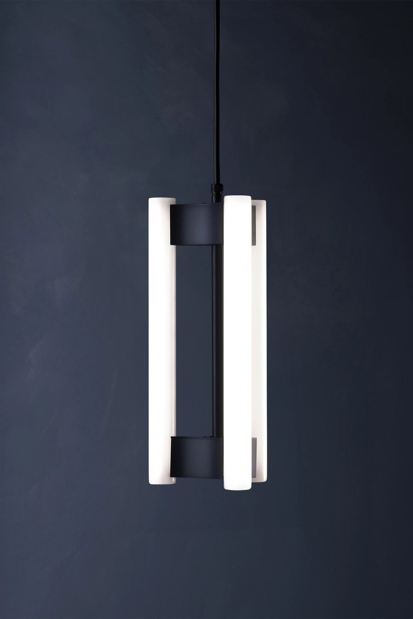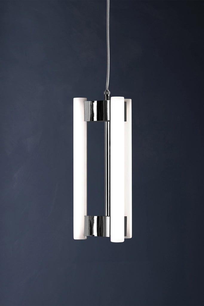 A KAIA DESIGN CLASSIC, SMALL PENDANT LIGHT LIA SEES THREE 300MM GLASS TUBES SUSPENDED BETWEEN TWO HAND-CRAFTED BRASS FIXTURES. EACH IS FINISHED IN A CHOICE OF POLISHED NICKEL, BRUSHED NICKEL, BRUSHED BRASS, OR BLACKENED BRASS. THIS IS SUSPENDED FROM THE CEILING WITH A BLACK FABRIC CABLE.
