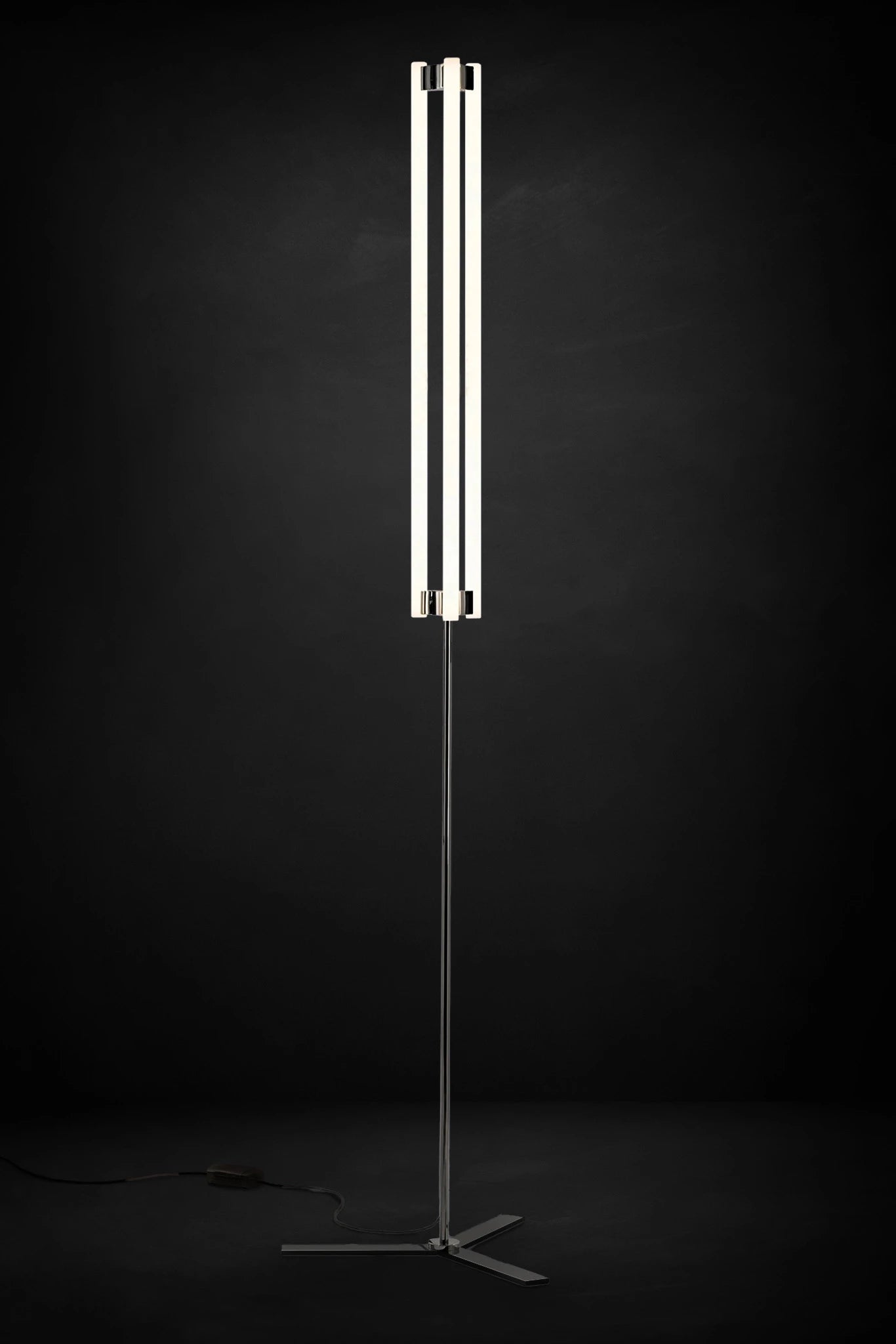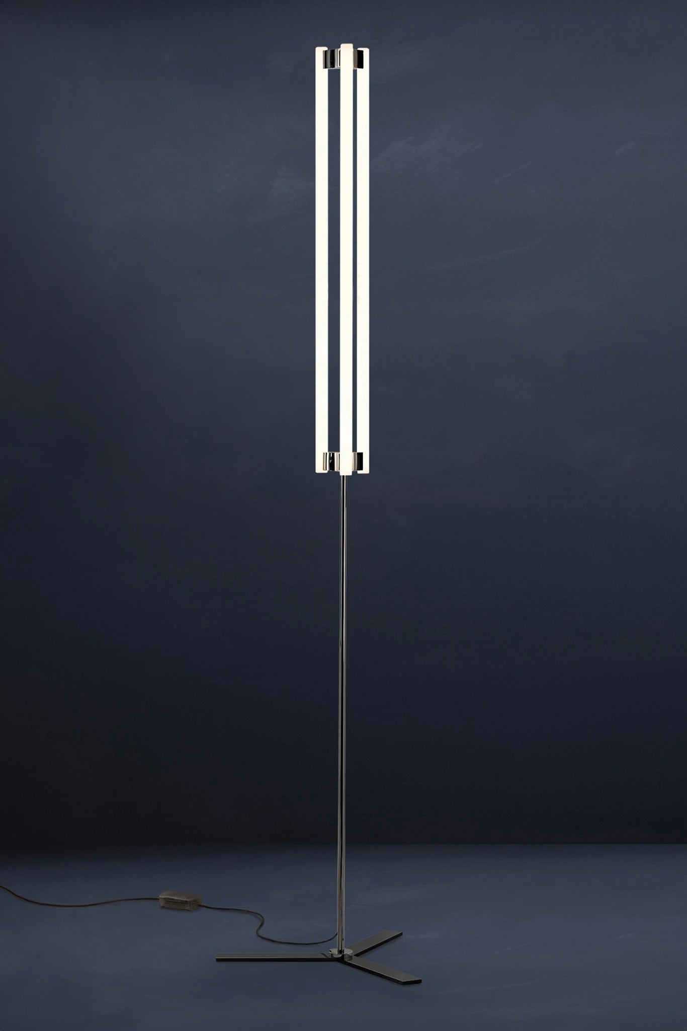 A KAIA design classic, modern LED floor lamp LIA sees three glass tubes suspended between two hand-crafted brass fixtures, each finished in a choice of polished nickel, brushed brass, or brushed blackened brass. This is fixed to a brass stem and base with black cord cables, reaching a height of 2150 mm.