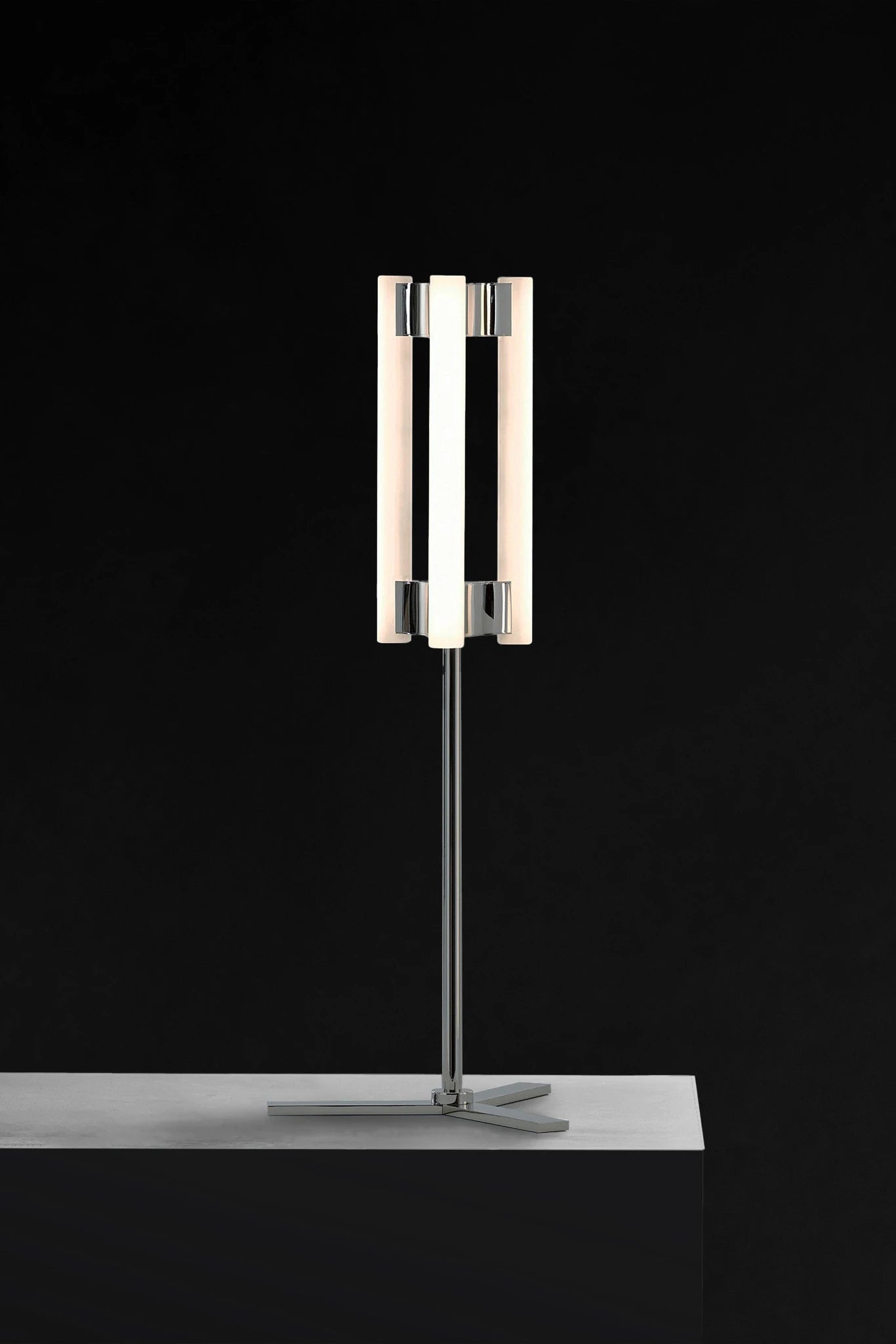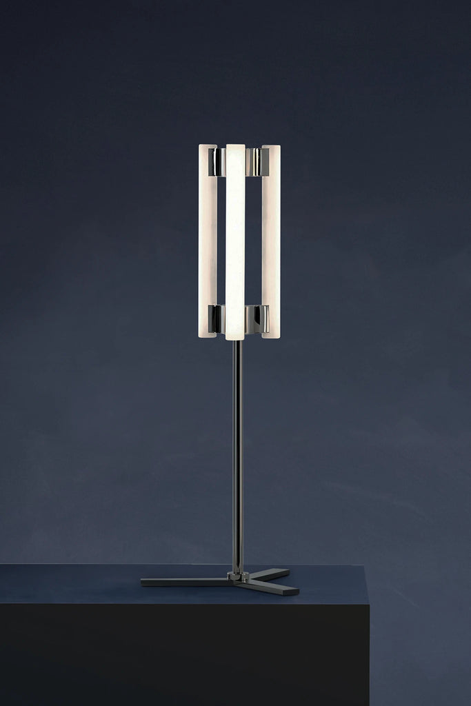 A KAIA design classic, modern table lamp LIA sees three glass tubes suspended between two hand-crafted brass fixtures, each finished in a choice of polished nickel, brushed nickel, brushed brass, or brushed blackened brass. This is fixed to a brass stem and base with black cord cables, reaching a height of 670mm.