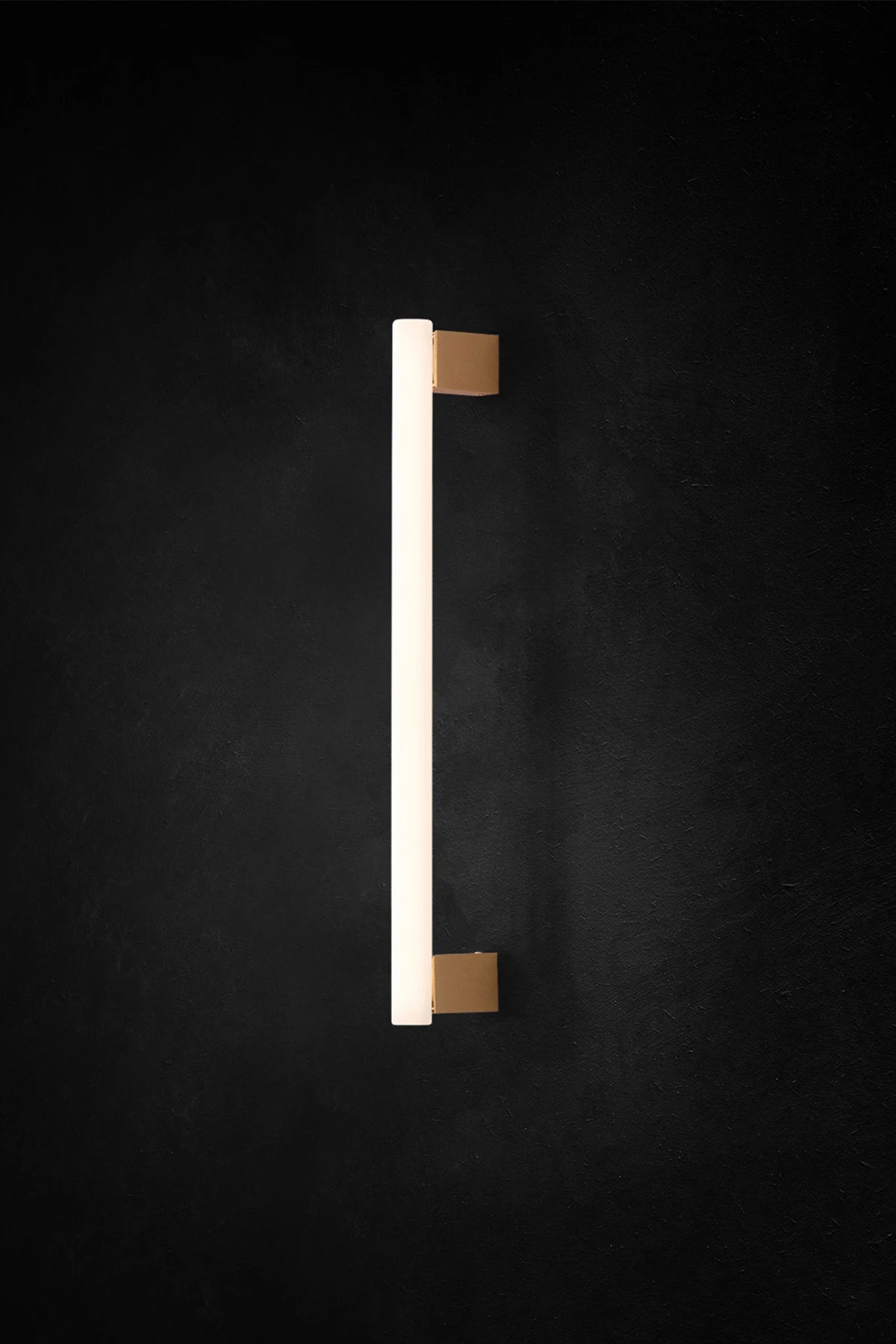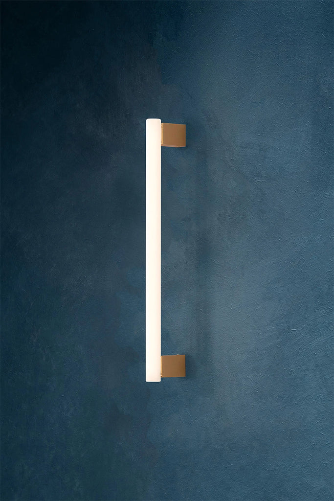 MEA is a collection of designer wall lights that embodies aesthetic minimalism. A 500 mm tube of glass is anchored to the wall or ceiling by brass fixtures at each end, transforming the linear lamp into an aesthetic object.