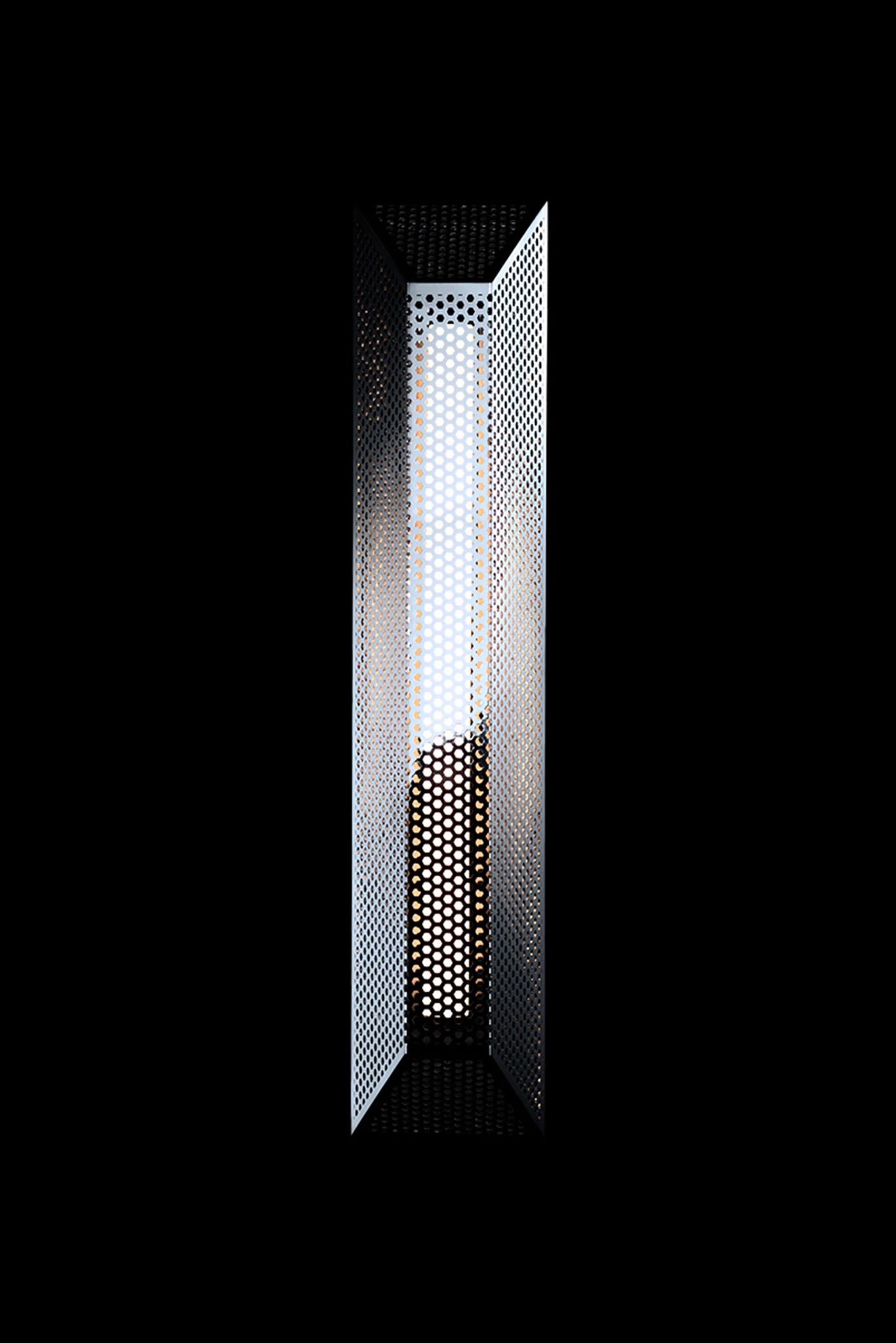 Born from the unique design of 'Empyrean', 'Trap' is a perforated, polished stainless steel sconce housing a KAIA classic, NEA. In opposition to its counterpart, 'Trap' encloses the warm glow of its LED lamp to provide a soft, indirect light source which is suitable for both internal and external applications.
