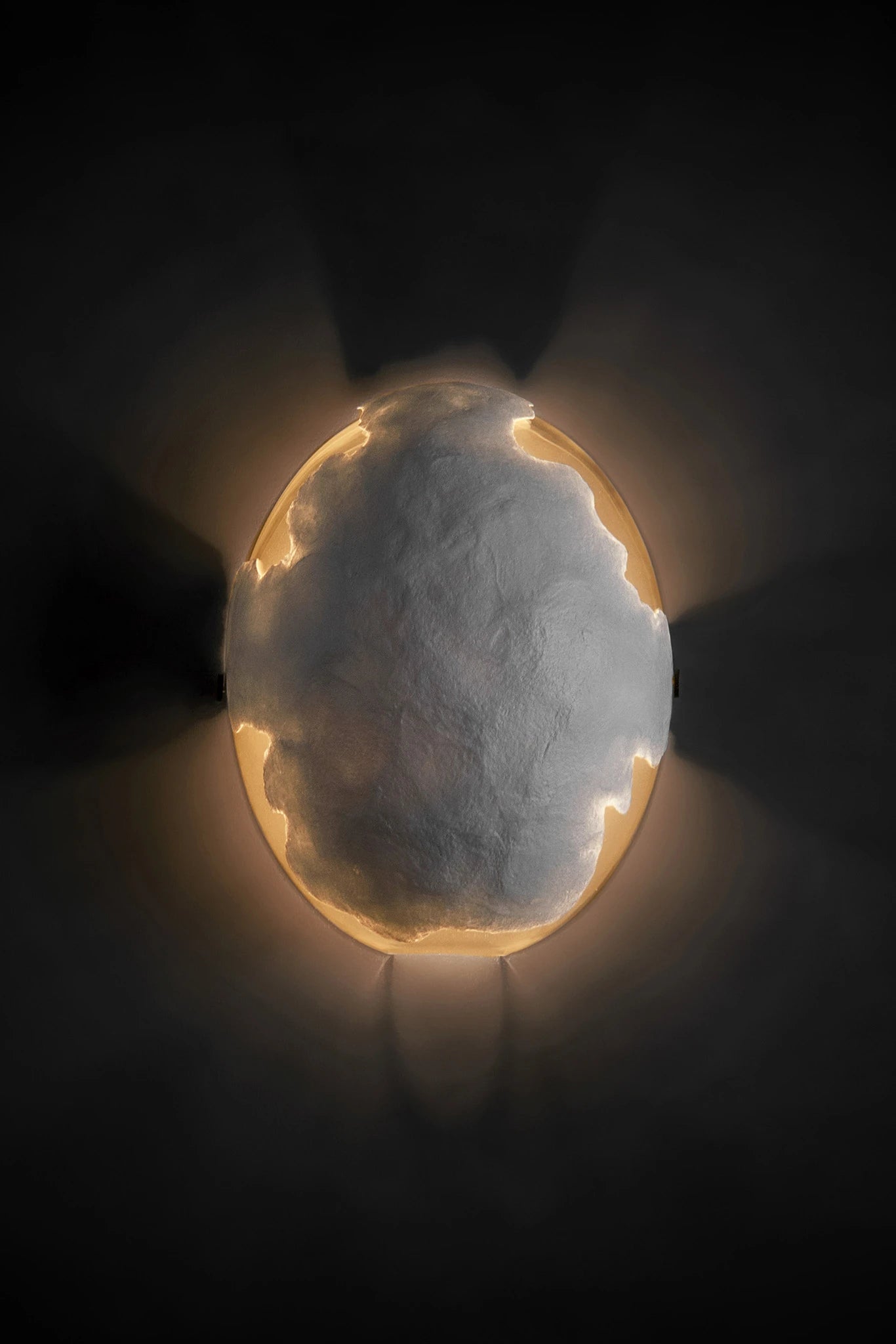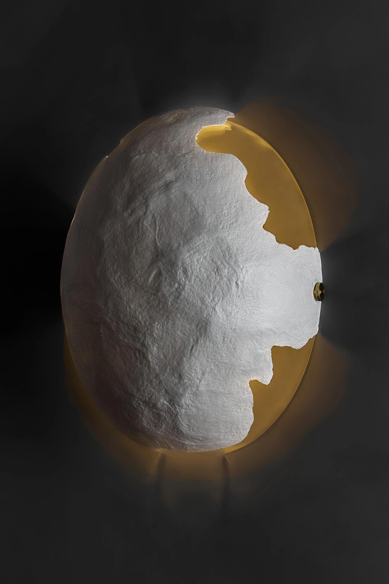 The collection’s signature egg-shaped silhouette is the focal point for the GLOW WALL LIGHT. The raw papier-mâché sourced from Italy ‘grows’ across the top of the orb, encasing the light so as to cast a delicate, subtle glow over the room.