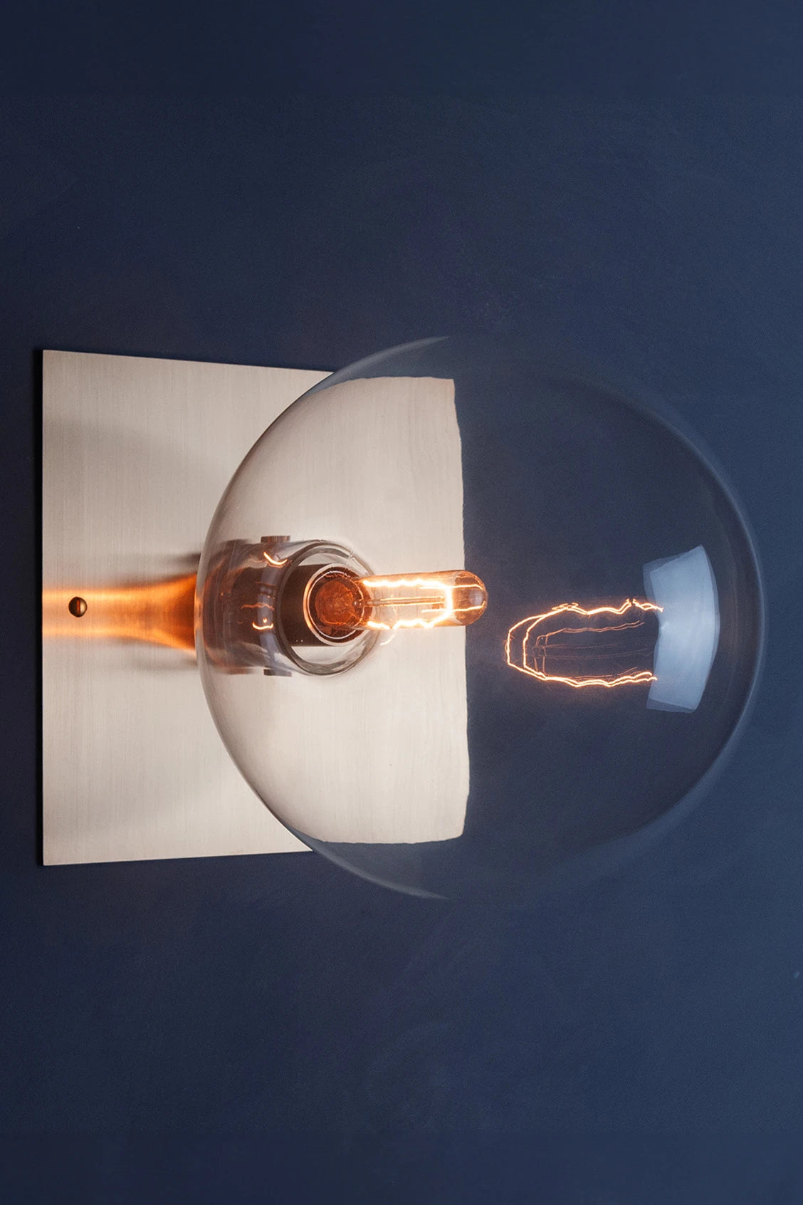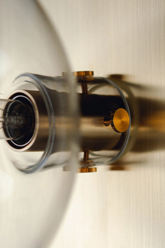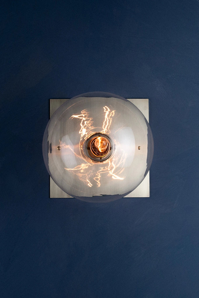 The essence of our ORA collection is encapsulated in one minimalist glass ball wall light. An oiled and waxed brass backplate holds in place a single hand-blown glass in ORA Wall 200, creating a refined wall light that is both contemporary and timeless. This is the largest iteration in the ORA Wall series.