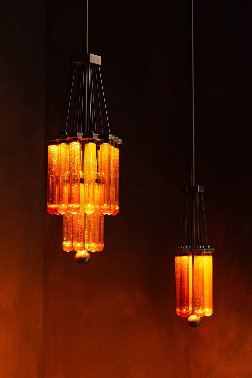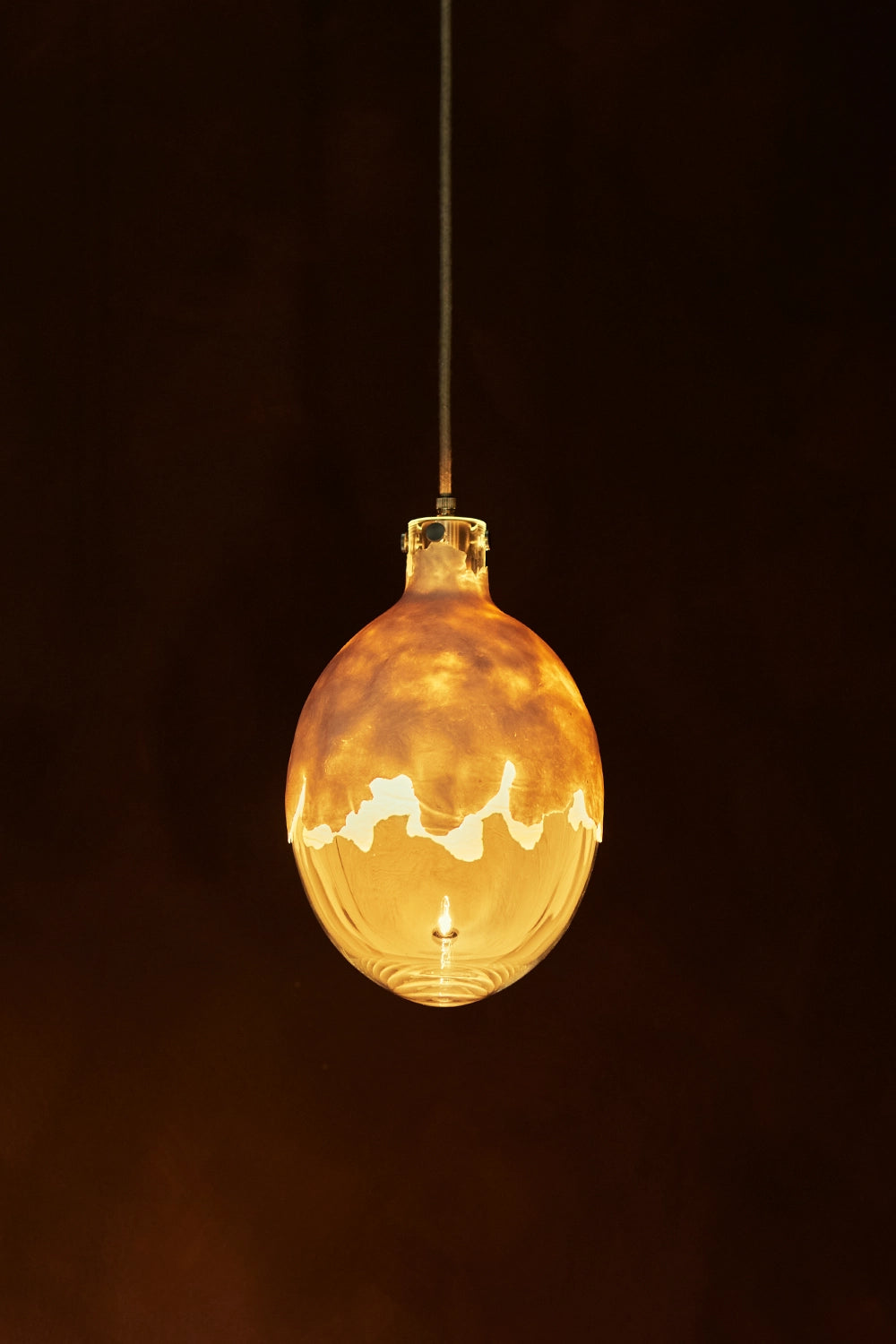 Architect and designer Sophie Dries created the Glow Suspension with sustainability at its core. A recycled papier-mâché coating, crafted in Puglia, wraps around a hand-blown glass form, resulting in a tactile, organic surface that highlights the beauty of reused material.