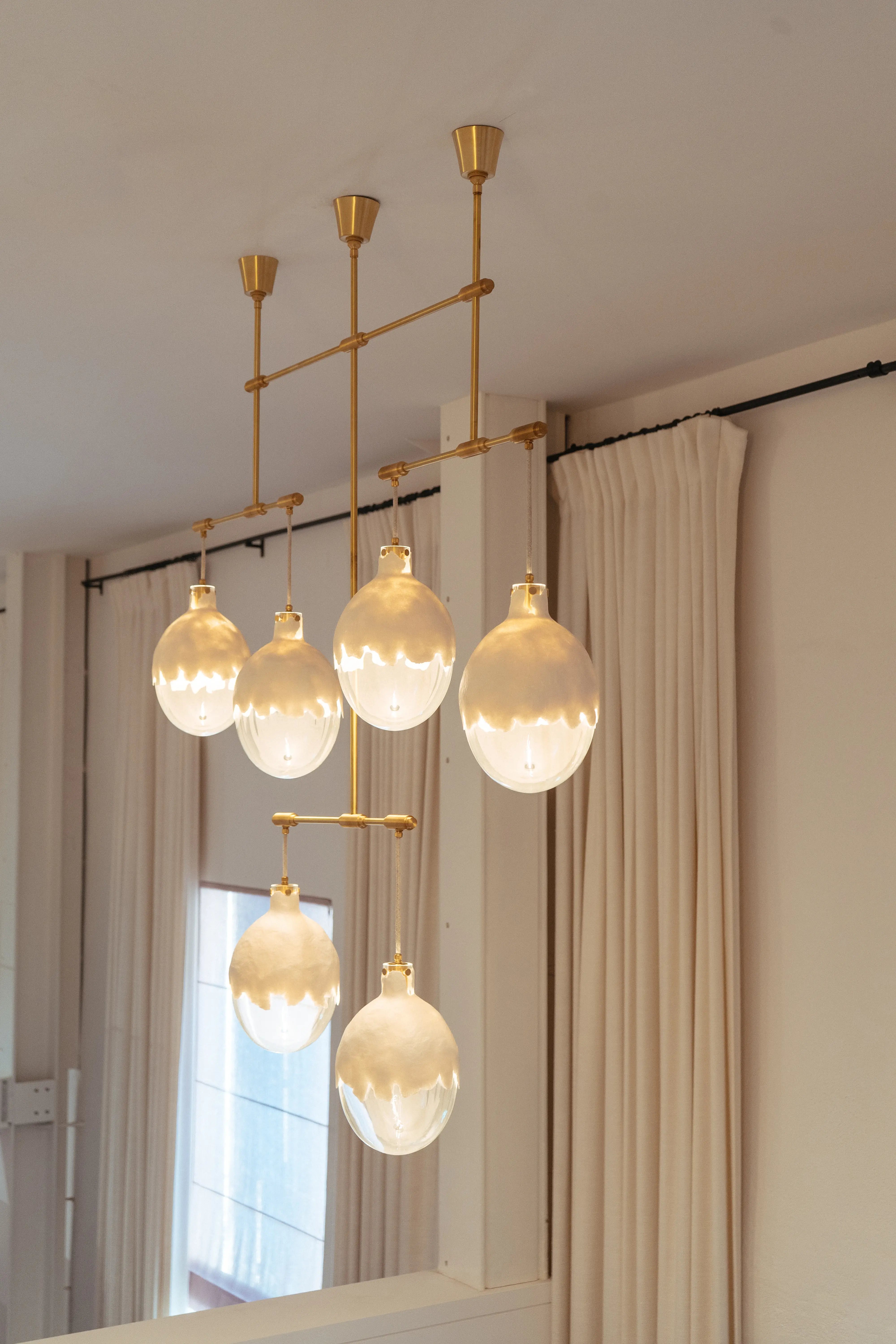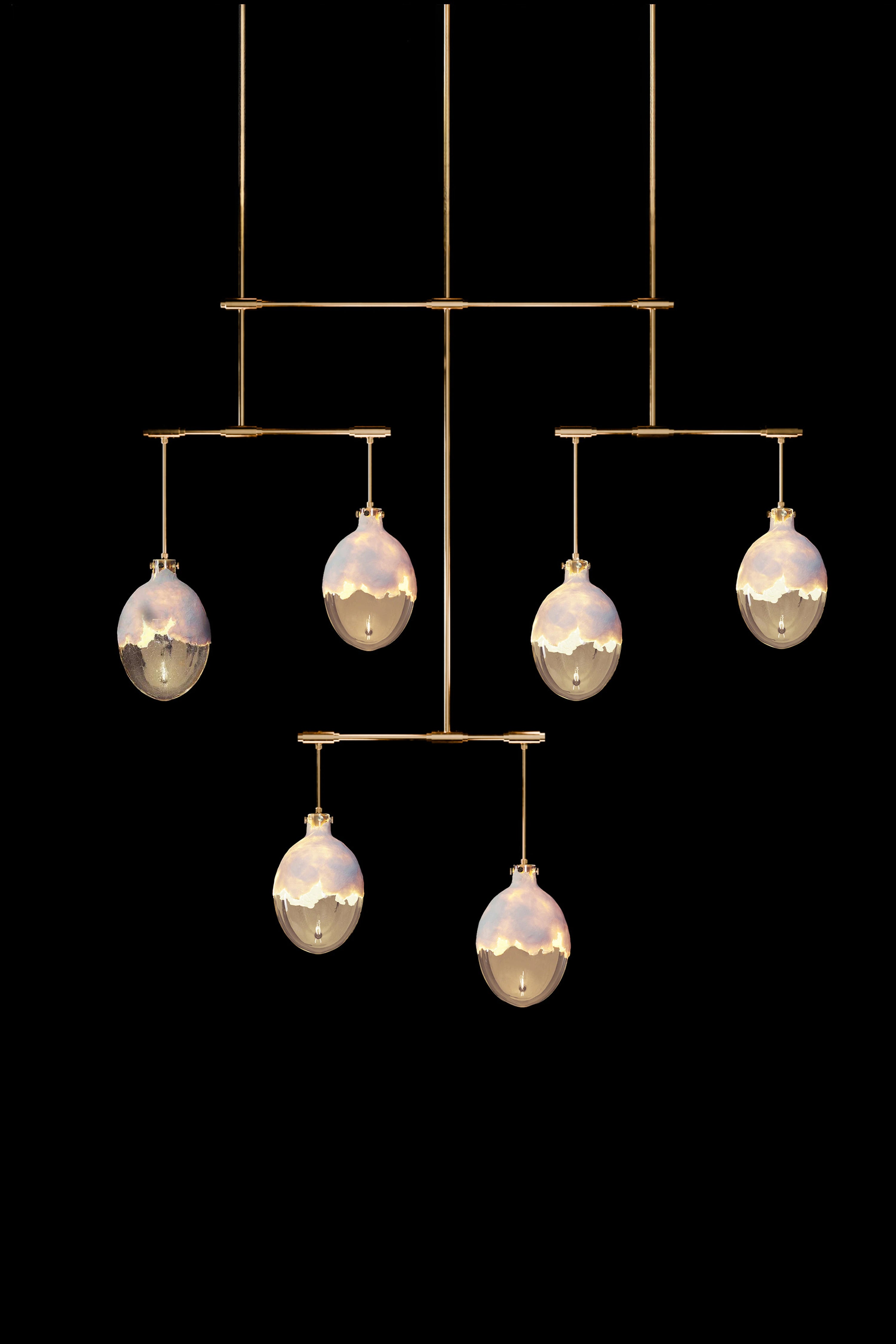 The raw paper appears to ‘grow’ over five mouth-blown glass eggs, suspended at varied heights by hand-crafted brass to create a chandelier that contrasts sharp geometricity with organic form. Part of the GLOW collection in collaboration with Sophie Dries, GLOW 5 is a lighting object in which technical precision and material delicacy sit side-by-side.